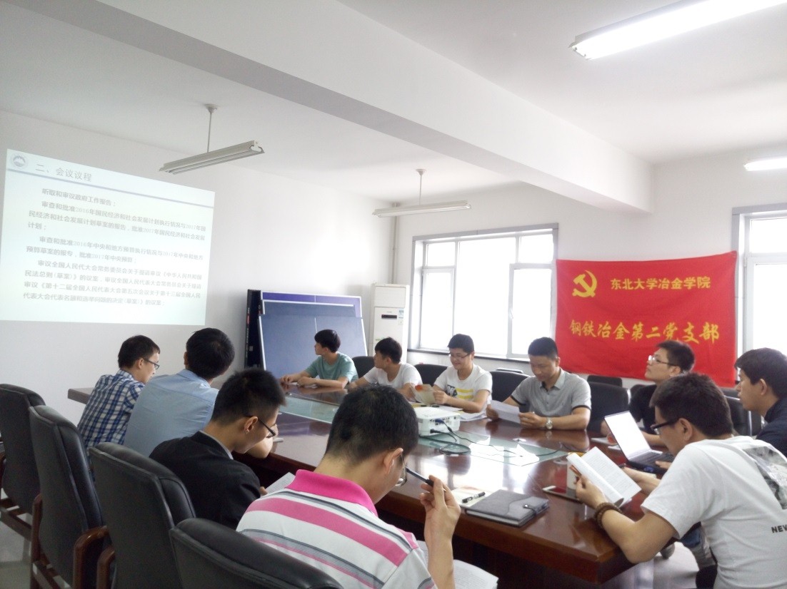 2017年6月2日,钢铁冶金第二党支部在新钢铁楼510开展“两会热点解读”专题活动。活动由支部书记董艳伍同志主持。董艳伍同志根据两会内容,为大家梳理了十大热点关键词。从“医疗”,“中国制造”,“京津冀协同发展”,“消费”,“蓝天白云”,“教育”,“户籍改革”,“个税改革”,“住宅土地使用权”和“养老”等方面详细介绍了两会的主要内容。之后,董艳伍同志带领大家对两会内容进行了广泛而热烈的讨论。