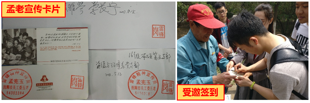 展览馆出口处草坪旁边,一位红帽老者在紧张有序的准备手中材料,胸戴雷锋头像,左臂袖标上印有“抚顺市志愿者”。他是抚顺市关工委五老-孟宪玉,雷锋精神宣传员。手持卡片,一边微笑,一边发放着印有雷锋经典语录的宣传卡片。卡片上的文字印象深刻,为雷锋日记中的语句: