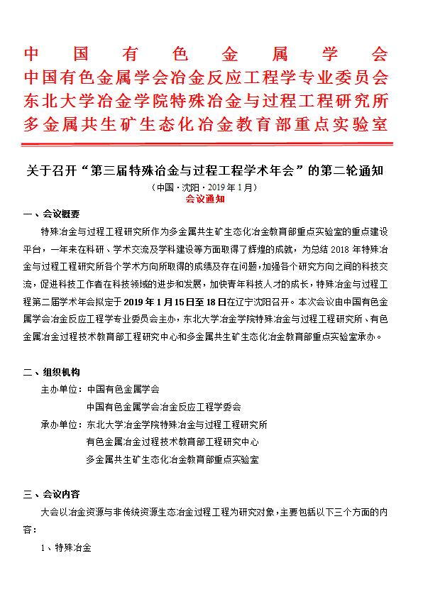 关于召开“第三届特殊冶金与过程工程学术年会”的第二轮通知