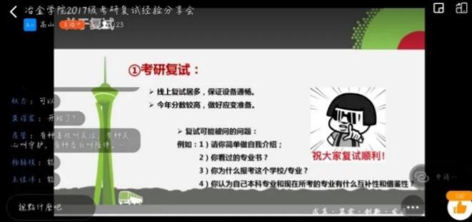 高山主要从考研复试前期准备、考研调剂建议和是否“二战”三方面进行介绍。会议伊始,高山总结了考研复试前需要注意的事项,强调了今年线上复试的特殊性,提醒参与复试的学生要提前调试好复试设备,保证网络通畅。高山提前汇总了往届考研学生的上岸经验,并着重调自信心的重要性,鼓励学生自信勇敢的表现出自己的长处。随后,高山强调了考研调剂的重要性,建议考研初试成绩不理想的学生要理性认识调剂,关注各高校官方信息,提高“搜商”获取有效信息,积极尝试调剂,及时抢占先机,给自己多争取一条出路。紧接着,高山强调考研成绩不理想的学生要理性看待“二战”,要冷静思考一战失利的原因,切忌盲目跟风,要与家长做好沟通、共同商议,同时建议珍惜“应届生”身份的优势积极参与下周学校双选会。