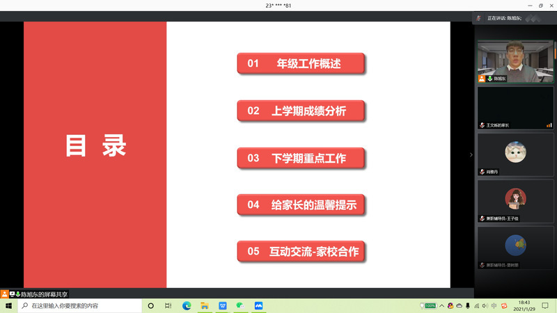 陈旭东首先围绕上学期年级整体工作向全体家长进行了充分介绍,其中包括军训、入学教育、学风建设、班寝建设、特色工作等。随后,陈旭东对上学期学生成绩进行分析,重点介绍了绩点分布情况、挂科情况以及挂科原因。在下学期重点工作中,陈旭东主要介绍了下学期主要课程及往年挂科情况、转专业、专业分流、下学期工作规划等。最后,陈旭东列举了八条给家长们的温馨提示,包括疫情防控、学习成绩、良性沟通、心理健康、独立能力、管理尺度、全面发展、家长的重要性等,他强调父母是孩子的第一任老师,父母对孩子的爱和教育,将成为孩子们前行路上最大的动力,愿家长与学校、学院一起为学生的成长之路保驾护航。