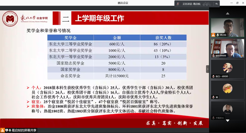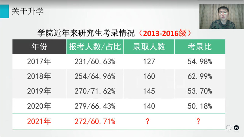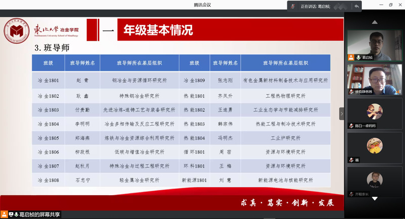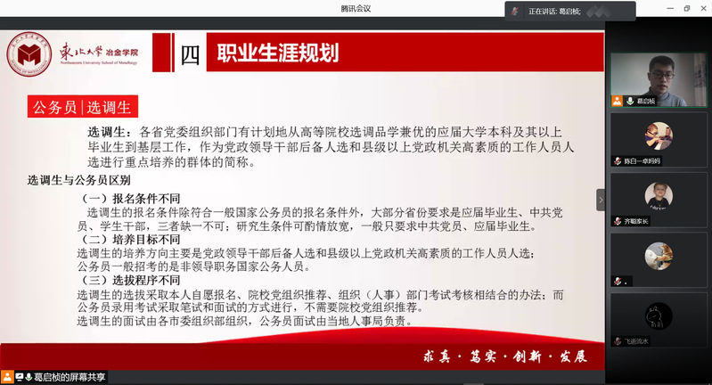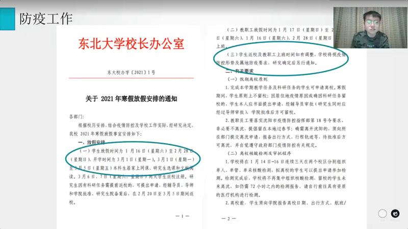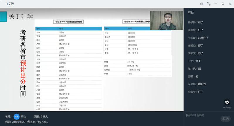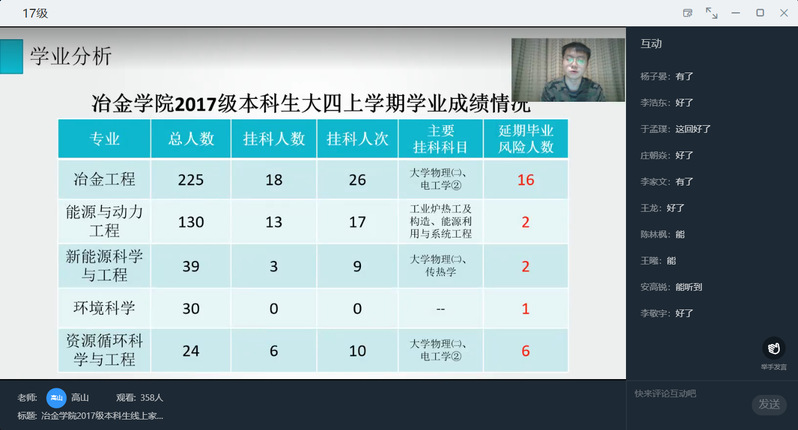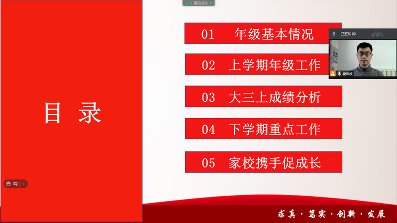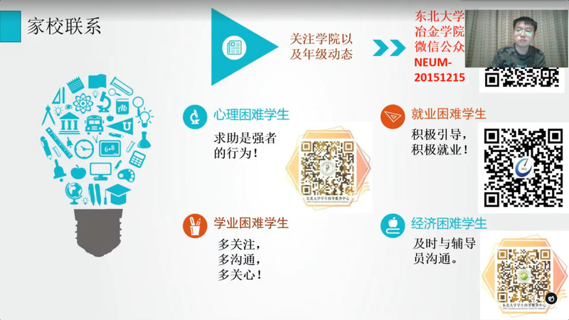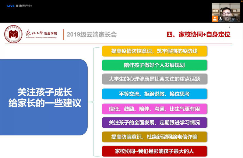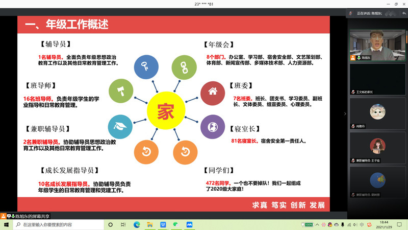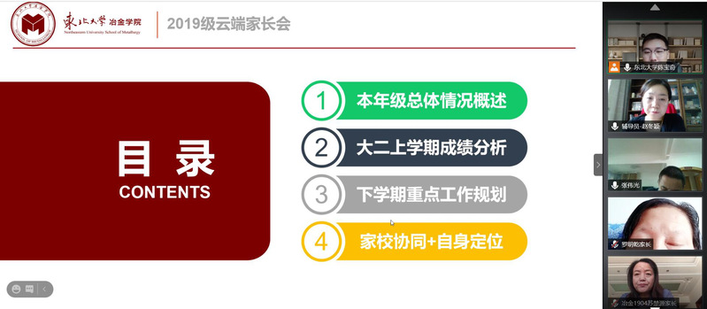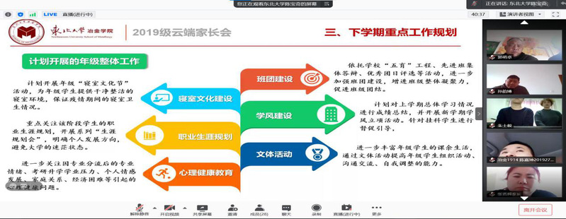 首先,高山通过统计数据的形式,向家长介绍了大四上学期学业成绩总体情况。随后,在升学方面,高山对学院近年来研究生保送情况、考录情况进行介绍,着重提示家长考研省份的相关查分时间,并从注意信息、明确方向、投递简历和准备复试四方面强调考研积极调剂的重要性。在就业方面,高山介绍了2017级本科生目前就业情况,列举了截至2021年2月各专业的主要签约就业单位,并希望家长与学院一起共同调动孩子就业积极性。紧接着,高山介绍了学校2021年寒假放假安排,并着重强调假期中间未经审批,不得再次返回校园。最后,高山呼吁家长们在学生本科学习的最后半年期间,能够及时关注学院及年级动态,与辅导员沟通交流,关心学生的学习与成长,尤其是对有心理、就业、学业和经济困难的学生给予更多关爱与支持。