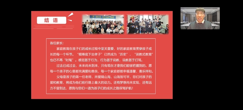 在家校协同-互动交流环节,各位班导师和学生家长间进行了充分的沟通交流,班导师们在学生的成才教育、个人发展规划、保研考研就业准备、家庭教育助力和家校协同等方面与家长进行了深入沟通。两位兼职辅导员李新颖、王耀松也从更接近学生的角度与全体家长进行了互动并分享了家庭教育对于大学生成长的重要性。赵冬颖从学生家长如何找准自身定位,如何做好个人职业规划,如何认清并解决学生出现的问题,家庭在学生教育中发挥什么样的作用和家校协同我们怎么做等方面进行了简要总结,并认真回答了学生家长关于考研、就业、定期开展家校交流等的问题。