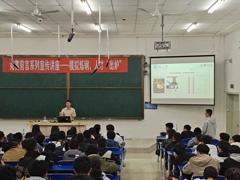 报告伊始,战东平教授首先从学业规划方向、就业、升学、出国等四个方面,与同学们分享了为什么要参加科技竞赛。他以企业实际案例为例,强调新型基础设施建设支撑钢铁工业智能制造,希望大家能够积极参与数字化炼钢赛事,如世界模拟炼钢挑战赛、全国大学生冶金科技竞赛等。他详细介绍了本次世界模拟炼钢挑战赛的赛程和比赛方式,以及之后培训、考核及校内比赛的相关事宜。
