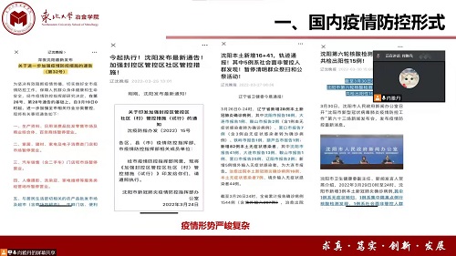 研究生辅导员杜宇密切关注研究生思想动态,在校生是否存在生活困难,科技产业园学生的核酸检测情况,在沈走读生居家情况,未返校学生的居住地点,所处疫情重点管控地区上海及境外交流学生的身体健康状况等。召开疫情防控研究生学生干部工作推进会,介绍学校、学院目前疫情防控情况和要求,加强对校园封闭期间学生干部的工作要求,以及对研究生日常生活的关心和关爱,注重教育引导,期望全体研究生平稳度过特殊时期。
