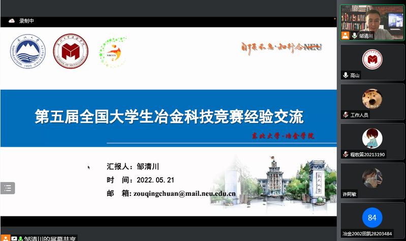 本期竞赛讲座重点围绕第五届全国大学生冶金科技竞赛国赛备赛展开,邹清川老师结合指导学生曾参加第三届、第四届全国大学生冶金科技创新大赛分获一等奖和特等奖的经验,主要从团队介绍、赛程安排、文本撰写和典型案例以及答辩经验分享等四个方面为国赛参赛选手详细讲解,并就如何深化选题与撰写说明书等方面多角度地指导大家认真备赛。最后,邹清川老师与同学们提出的问题进行了详细交流,并鼓励同学们认真备赛,取得佳绩!