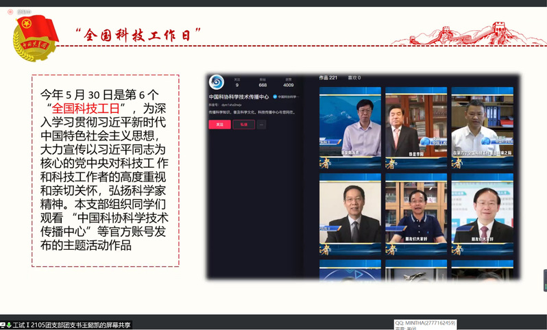 恰逢第六个“全国科技工作者日”,各团支部组织学习科学家精神,观看“中国科协科学技术传播中心”等官方账号发布的主题活动作品,勇立潮头,锐意进取。此外,部分团支部开展“你画我猜成语比赛”“图书漂流”等特色活动,增强团支部凝聚力。
