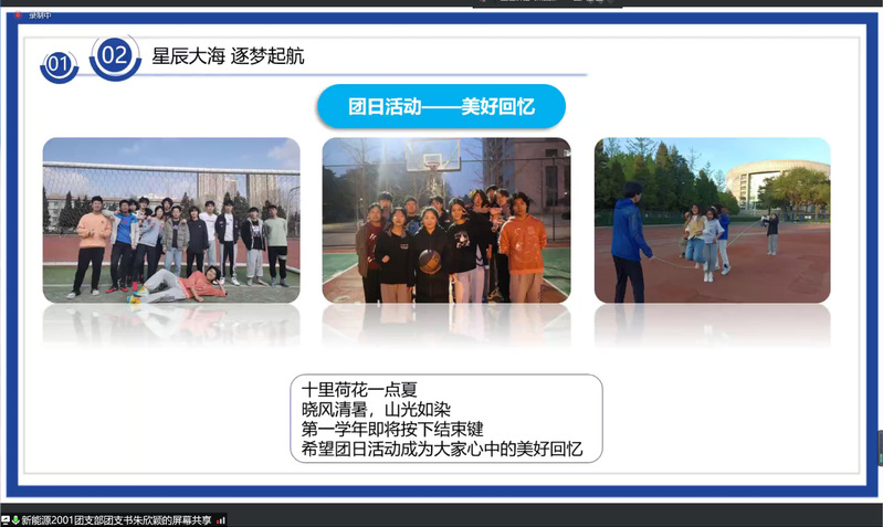 答辩会伊始,主持人介绍本次团日活动主题及答辩相关规则要求。随后,各团支部答辩负责人进行团日活动展示。各团支部紧紧围绕团日主题,组织观看庆祝中国共产主义青年团成立100周年大会直播,开展“四史”专题学习活动,依托“学习强国”“中国共青团网”“青年大学习”等平台,线上观看视频、研读学习材料,全面贯彻习近平总书记在庆祝中国共产主义青年团成立100周年大会上的重要讲话精神。