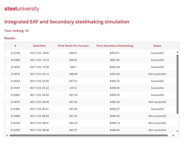 本次比赛采用在线钢铁大学提供的电弧炉炼钢和二次精炼集成模拟系统。要求参赛者以每吨最低的总成本,生产出符合要求的一定等级的钢材同时满足碳足迹要求。参赛者在24小时比赛期间,可以进行不限次数模拟炼钢。在模拟系统完成设定的时间内,炼钢结果已经汇总到比赛数据库,参赛者在收到成功完成任务的确认信息后,即完成一次模拟炼钢。