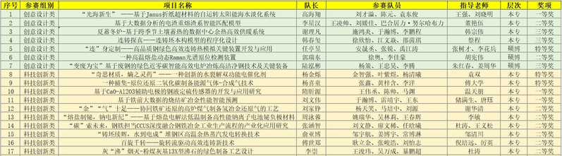 经作品初评、专家会评、决赛答辩等环节,学院张树才、李花兵老师指导作品《“连”身定制——高品质钢绿色高效连铸热模拟关键装置开发与应用》获得创意设计竞赛单元特等奖学院袁双老师指导作品《“奇思材质,熵之灵药”——一种创新的水裂解双功能电催化剂》傅大学老师指导作品《一种捕集-原位还原二氧化碳制备能源气体-合成气技术》冯浩、李花兵老师指导作品《高氮不锈钢加压电渣重熔高效脱硫控铝技术》朱红春、李花兵老师指导作品《加压凝固与合金优化协同的高航空轴承钢提质和减排新策略》胡宪伟老师指导作品《熔盐电解硫化铝制备金属铝基础研究》等五项作品获得科技创新竞赛单元特等奖学院谢锋、茹家胜老师指导队伍和符岩、金哲男老师指导队伍获得仿真实训竞赛单元火法炼铜特等奖。
