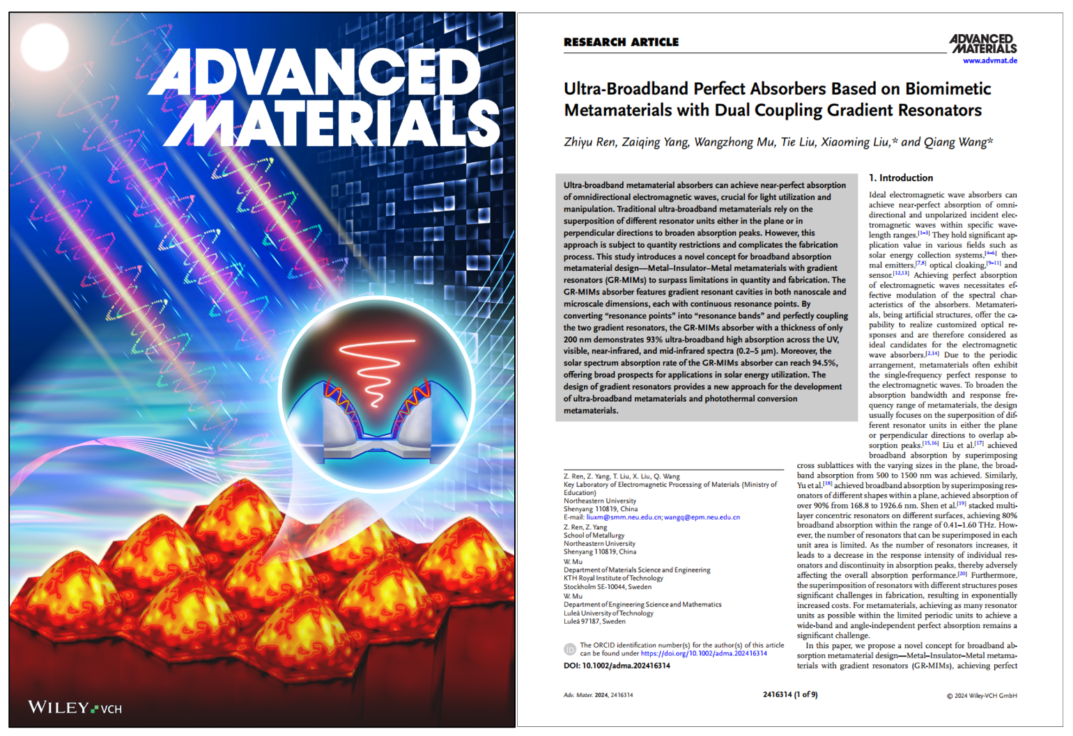 近日,PP电子游戏网站王强教授团队在太阳能光热利用宽频吸波超材料领域取得重要研究进展。相关成果以“Ultra-Broadband Perfect Absorbers Based on Biomimetic Metamaterials with Dual Coupling Gradient Resonators”为题被国际权威学术期刊Advanced Materials(影响因子27.4)封面文章重点报道。PP电子游戏网站为该论文的第一作者单位,PP电子游戏网站博士研究生任志宇为第一作者,刘晓明副教授与王强教授为共同通讯作者。
