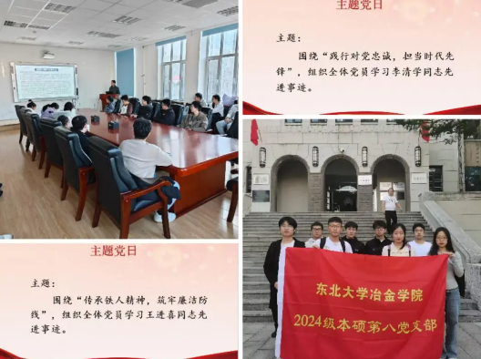 党支部本学期共组织了4次主题活动。首先从身边学起,组织全体党员参观科学家精神教育基地,学习老一辈东大冶金人科技报国的故事。此外,由党员准备红色故事在支部内分享,分别围绕彭士禄的廉洁家风故事、钱学森的科技报国之路、在葫芦岛市抗洪救灾中英勇牺牲的李清学同志事迹三个主题,对彭士禄、钱学森、李清学的典型事迹进行了学习。激发支部党员牢记初心使命,向优秀共产党员学习、看齐,发挥好青年党员的先锋模范作用。