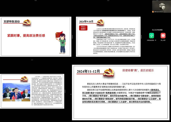 党支部组织党员轮流宣讲习近平总书记重要讲话精神和重要时事政治。开展特色活动半年来,主要宣讲内容包括《求是》杂志发表的习近平总书记重要文章《培养德智体美劳全面发展的社会主义建设者和接班人》、习近平总书记在出席金砖国家领导人第十六次会晤上发表的重要讲话《登高望远,穿云破雾推动“大金砖合作”高质量发展》。通过特色活动的开展,党员们表示收获颇丰,不仅提升了对理论和时事理解的深度,更在互相交流中得到启发,在日常生活中更加关注时事政治,加强党性锻炼,提升理论素养。