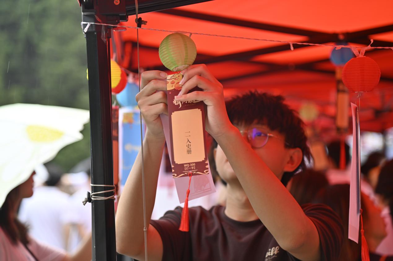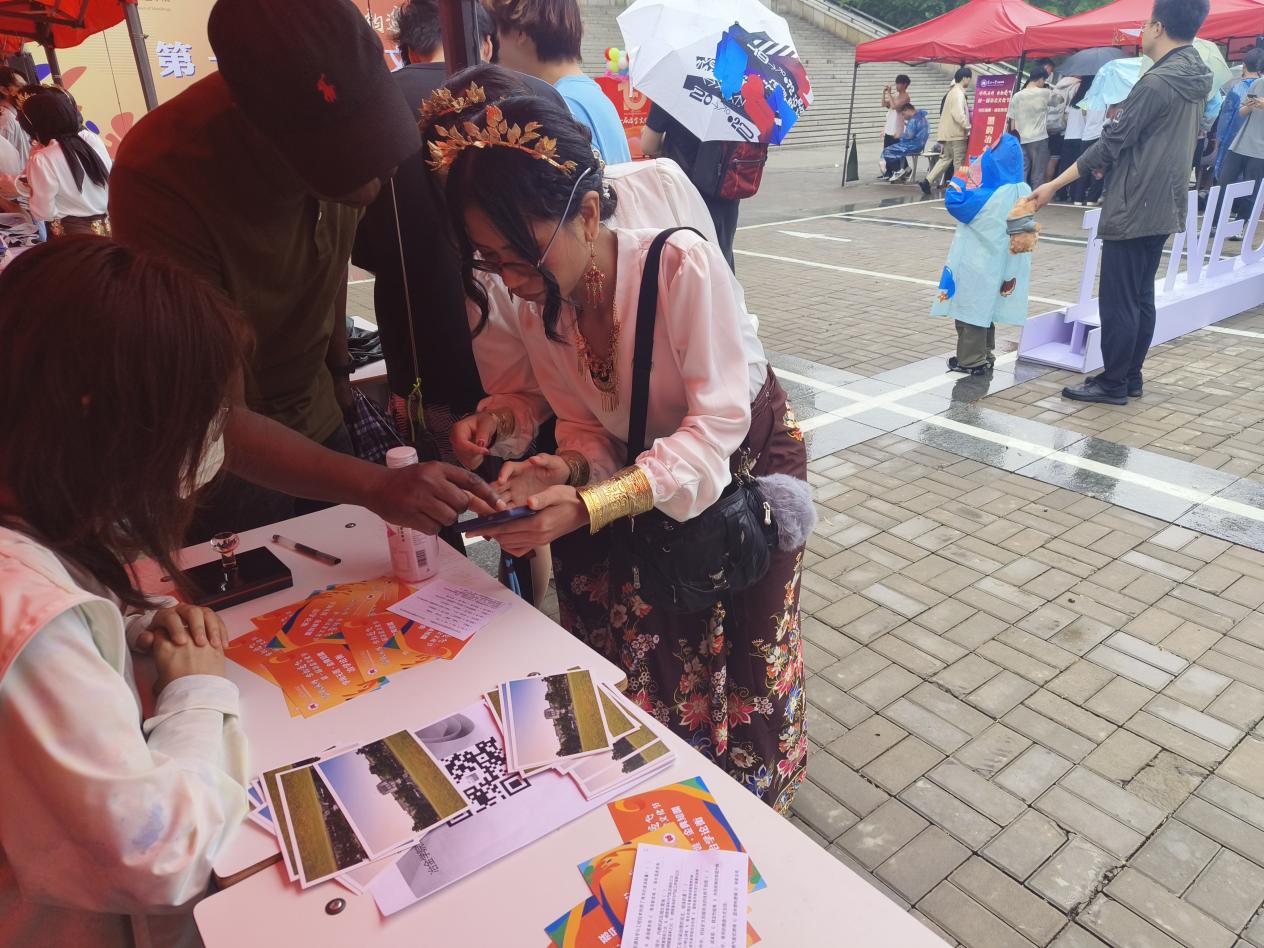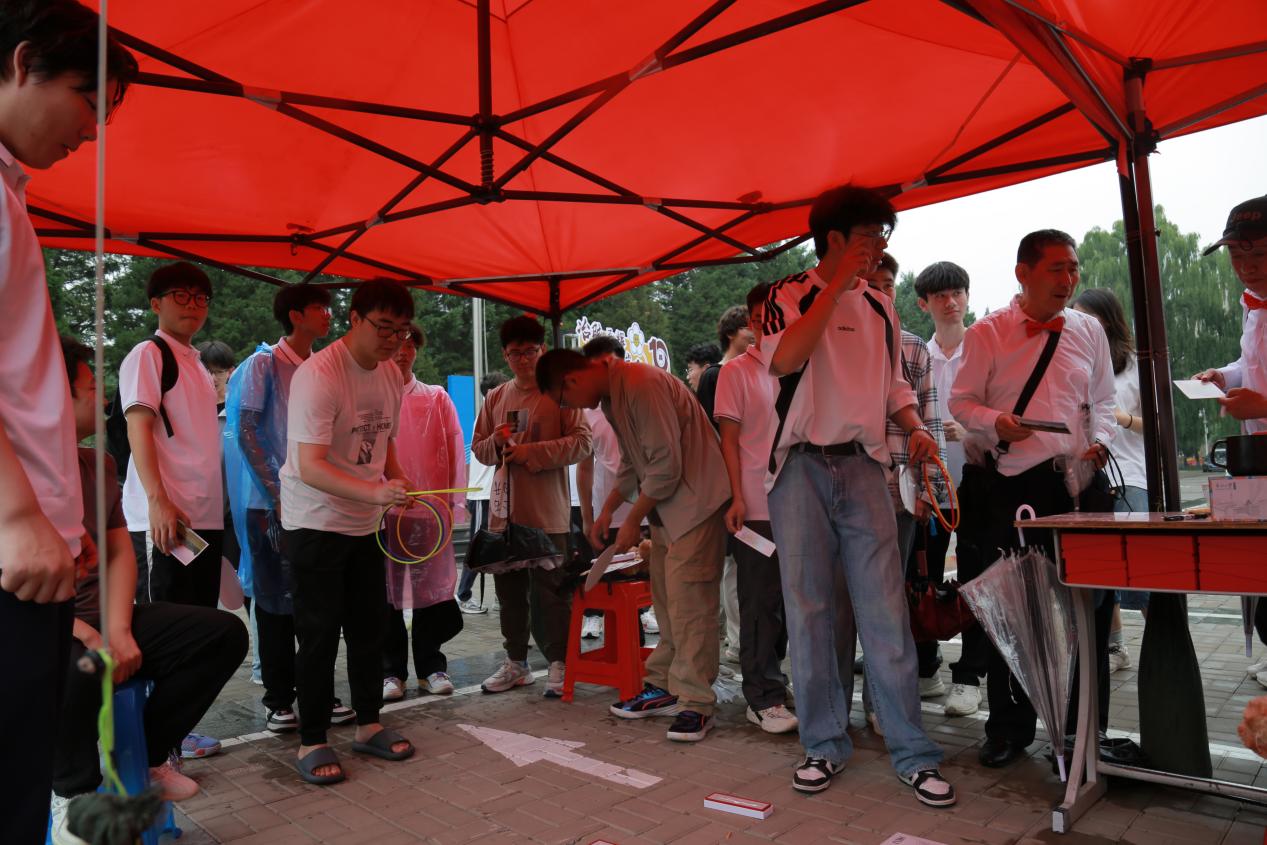 套圈游戏趣味十足,东大定制背包、毛绒公仔、金属书签等特色奖品引发阵阵欢笑与喝彩。