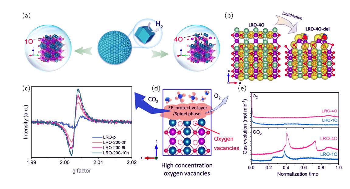 图注(a) H2诱导形成氧空位示意图,(b) DFT理论计算验证界面稳定性提高,(c)Vos浓度的规律性变化(d)Vos构建位点及表面EEI界面的形成(e)Vos缓解不可逆氧气释放