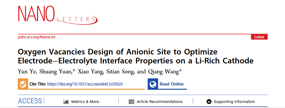 近日,王强教授团队(冶金与材料过程外场控制研究团队)在锂离子电池正极材料界面调控方面的研究取得重要进展。研究成果以“Oxygen Vacancies Design of Anionic Site to Optimize Electrode-Electrolyte Interface Properties on Li-rich Cathode”为题发表在美国化学学会期刊(自然指数期刊)《Nano Letters》上。PP电子游戏网站博士研究生叶芸为论文第一作者,王强教授和袁双特聘研究员为共同通讯作者,PP电子游戏网站为唯一通讯单位。