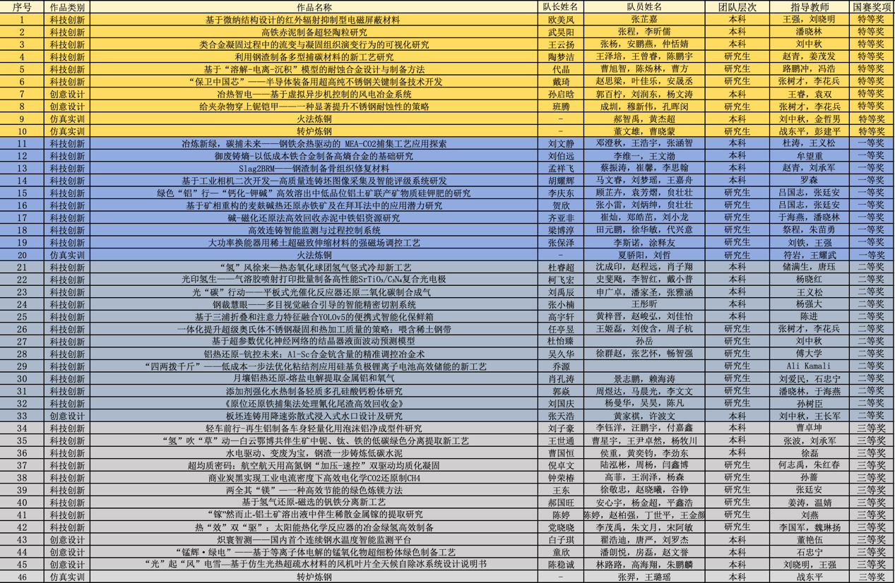 经作品初评、专家会评、决赛答辩等环节,张树才、李花兵老师指导作品《给夹杂物穿上铌铠甲——一种显著提升不锈钢耐蚀性的策略》,王睿、袁双老师指导作品《冶热智电——基于虚拟异步机控制的风电冶金系统》获得创意设计赛道特等奖;王强、刘晓明老师指导作品《基于微纳结构设计的红外辐射抑制型电磁屏蔽材料》,刘中秋老师指导作品《类合金凝固过程中的流变与凝固组织演变行为的可视化研究》,潘晓林老师指导作品《高铁赤泥制备超轻陶粒研究》,路鹏冲、冯浩老师指导作品《基于“溶解-电离-沉积”模型的耐蚀合金设计与制备方法》,赵青、姜茂发老师指导作品《利用钢渣制备多型捕碳材料的新工艺研究》,张树才、李花兵指导作品《“保卫中国芯”——半导体装备用超高纯不锈钢关键制备技术开发》获得科技创新赛道特等奖;刘中秋、金哲男老师指导队伍和战东平、彭建平老师指导队伍分别获得仿真实训赛道火法炼铜、转炉炼钢特等奖。