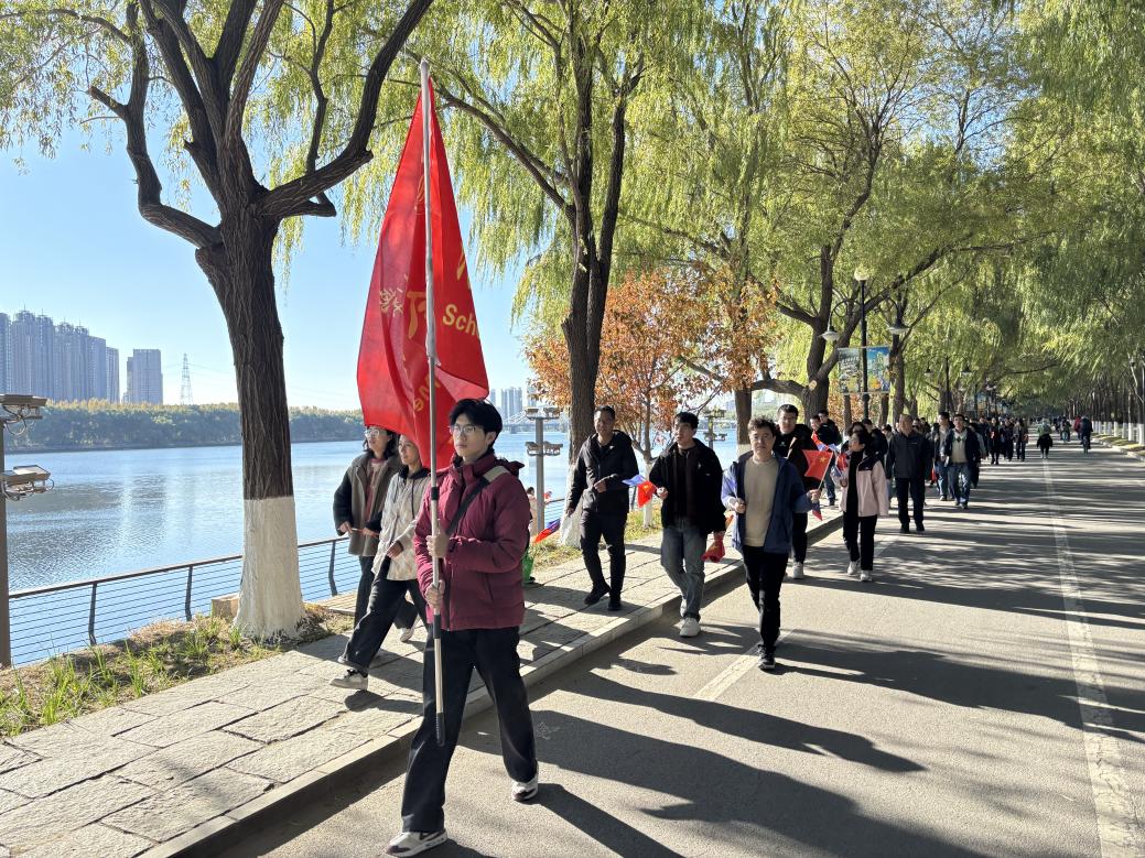 本次健步行活动以冶金学馆为起始点,途经学校南门、沈水湾公园、云飏阁等。教职工健步行队伍挥舞着旗帜,在秋日暖阳下一路欢声笑语。