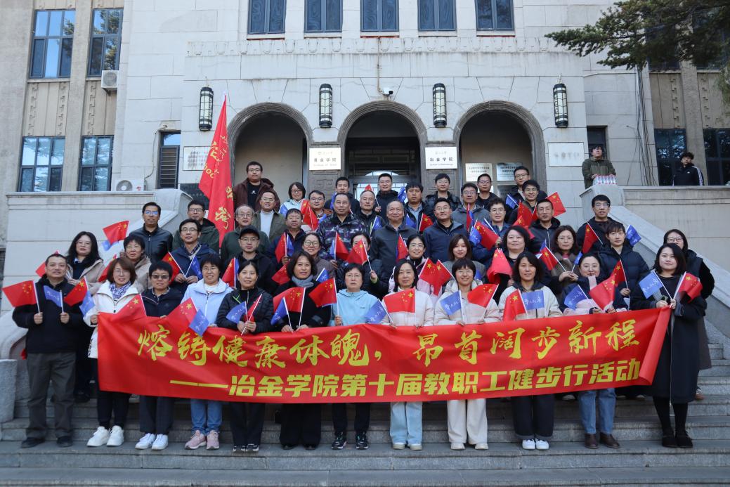 本次健步行活动以冶金学馆为起始点,途经学校南门、沈水湾公园、云飏阁等。教职工健步行队伍挥舞着旗帜,在秋日暖阳下一路欢声笑语。