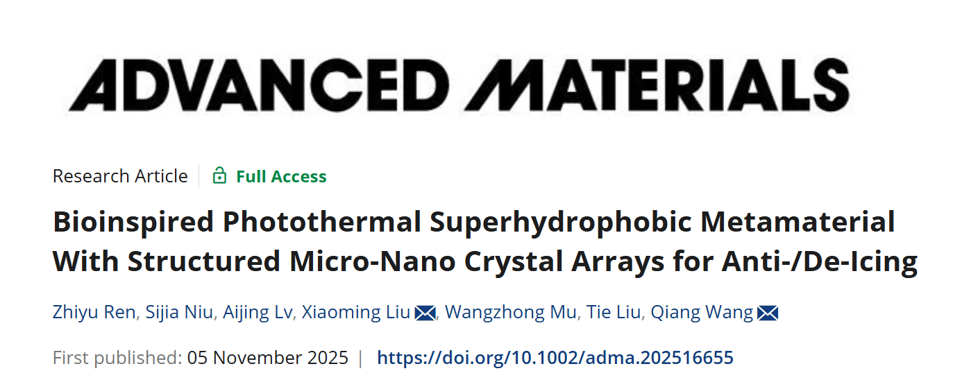 近日,PP电子游戏网站王强、刘晓明团队在光热超疏水超材料领域取得重要进展。相关成果以“Bioinspired Photothermal Superhydrophobic Metamaterial With Structured Micro-Nano Crystal Arrays for Anti-/De-Icing”为题发表在国际权威学术期刊Advanced Materials(影响因子26.8)。PP电子游戏网站为该论文的第一作者单位,PP电子游戏网站博士研究生任志宇为第一作者,刘晓明副教授与王强教授为共同通讯作者。