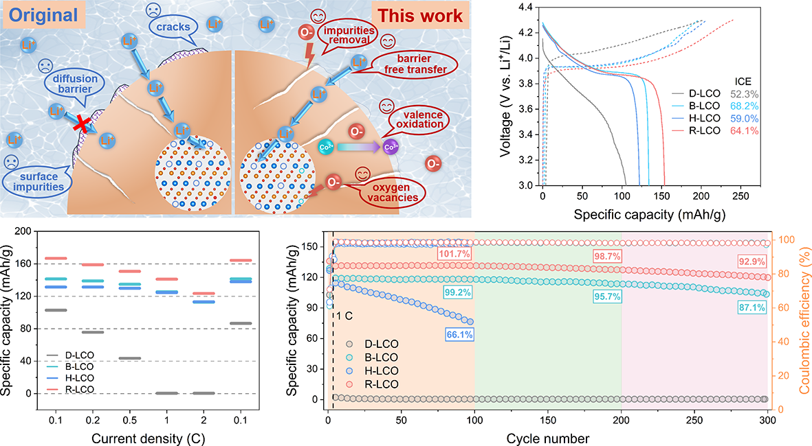 该团队提出了一种基于氧自由基(O⁻)辅助的结构修复策略以实现失效钴酸锂(LiCoO2)正极的高性能直接再生。通过在传统水热过程中引入H2O2并在后续退火中进行Ti4+掺杂,成功清除了电极表面的有害杂质与尖晶石相Co3O4。由O−诱导产生的表面氧空位促进了Li+的补充与后续Ti4+的均匀掺杂,Ti4+作为结构支柱,提高了电化学过程中的结构稳定能力,实现了正极材料层状结构的完整修复与电化学性能的高效再生。团队通过选用绿色试剂H2O2,使用简单的水热退火工艺,同步实现了尖晶石相的高效转化、表面杂质的清除和裂纹的修复,同时促进表面氧空位的形成,为后续Ti4+掺杂降低了扩散能垒。而Ti4+的均匀掺杂则提高了再生材料的结构稳定性,有效抑制了充放电过程中的结构退化与有害相变。再生后的LiCoO2正极材料在1.0 C倍率下展现出141.1 mAh g−1的高可逆容量,300次循环后容量保持率高达92.9%,性能优于原始商业材料。该策略为退役电池正极材料的高值化回收与再利用提供了一条简便、经济且无污染的新方案。PP电子游戏网站分析测试中心为数据采集和表征工作提供了重要支撑。